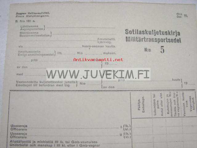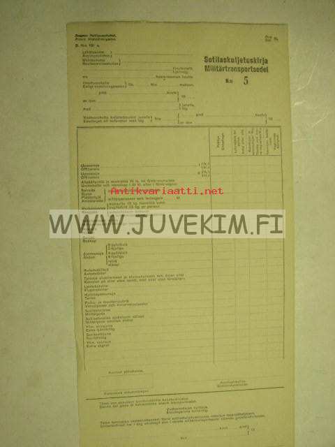 Valtionrautatiet / Sotilaskuljetuskirja -rahtikirja