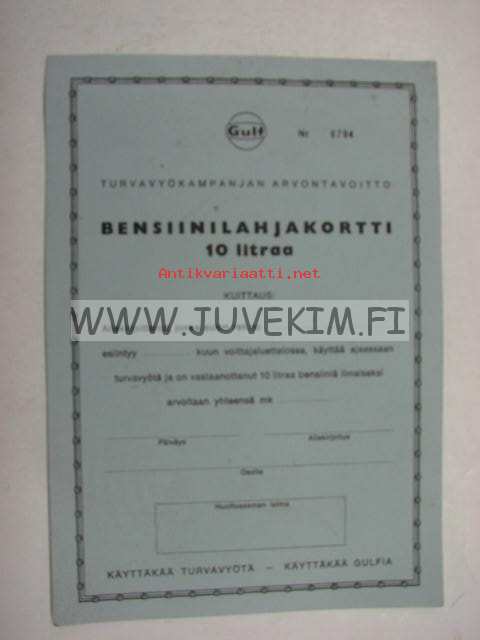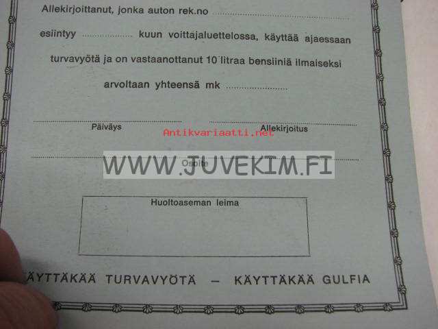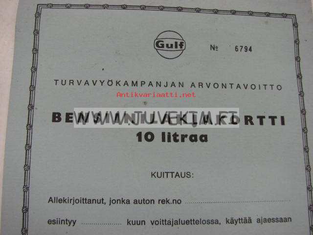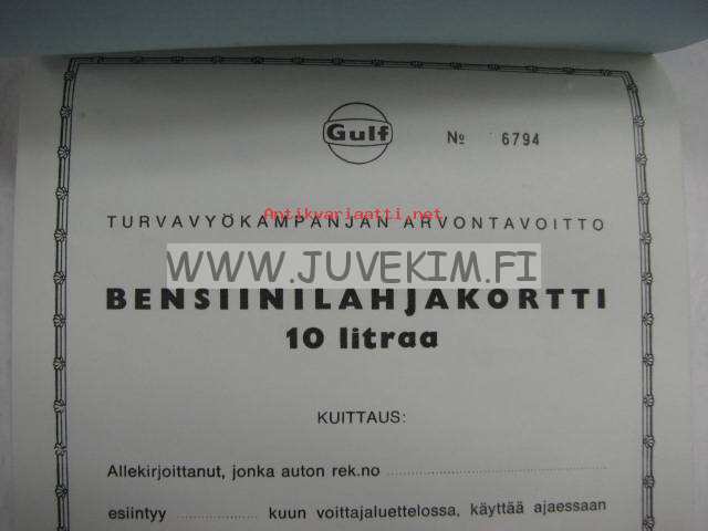 Gulf turvavyökampanjan arvontavoitto - Bensiinilahjakortti 10 litraa nr 6794