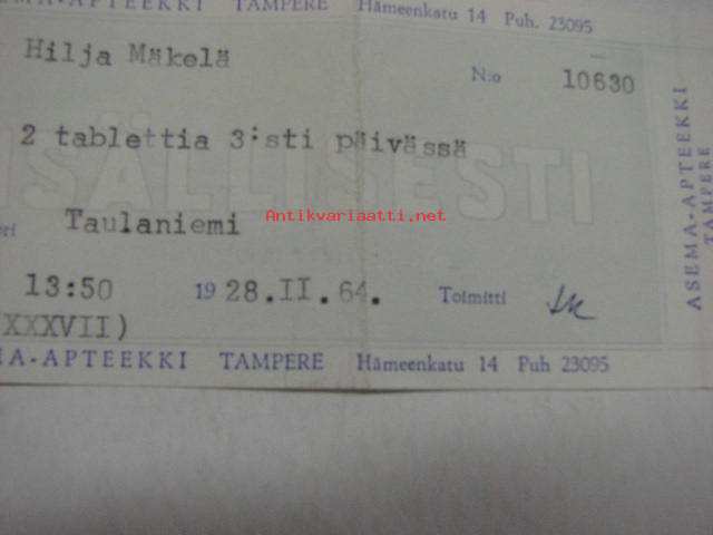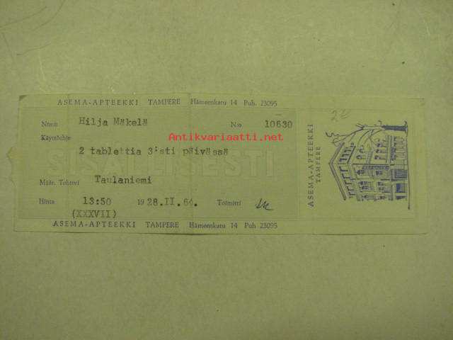 Asema Apteekki Tampere 28.2.1964 -apteekkisignatuuri