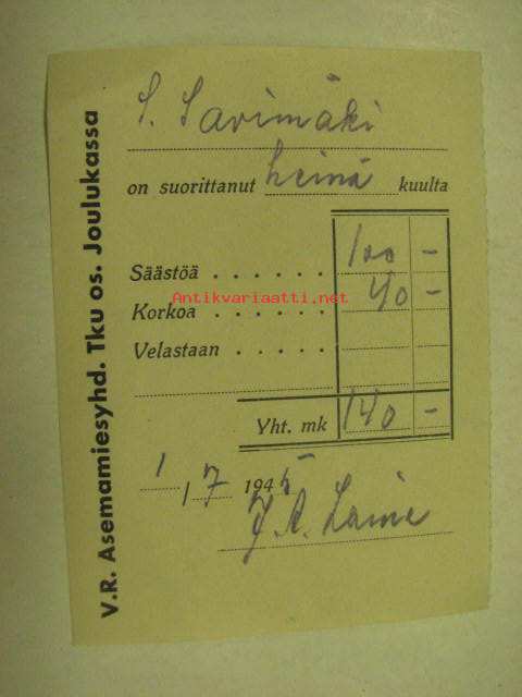 VR asemamiesyhdistys Tku os. Joulukassa -kuitti S. Savimäki