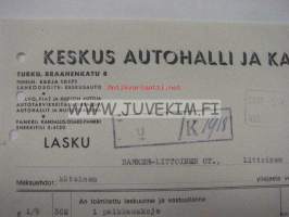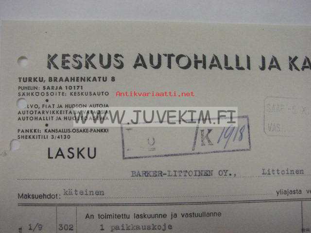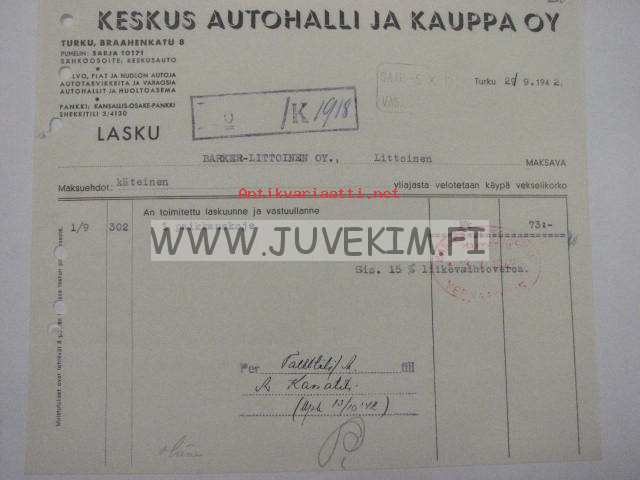 Keskus-Autohallin kumikorjaamo Turku, Braahenkatu 8.(Nyk. Brahenkatu) Lasku Barker-Littoinen OY:lle 29.9.1942