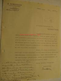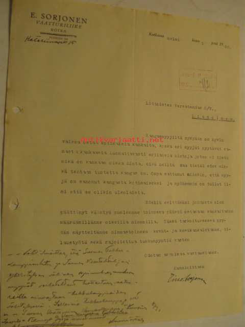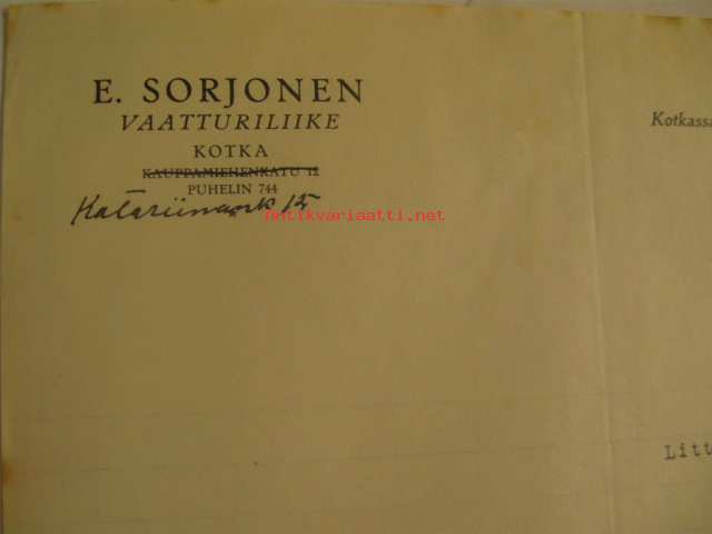 E. Vaatturiliike Sorjonen Kotka 1.2.1933 -asiakirja