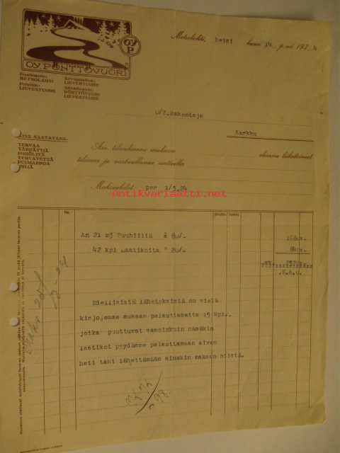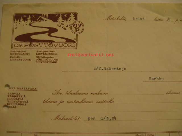 Oy Pönttövuori Lievestuore Metsolahti 14.2.1924 -asiakirja