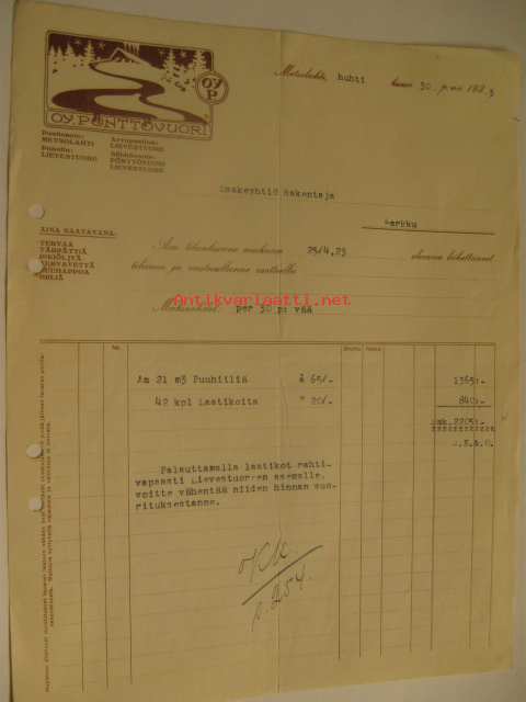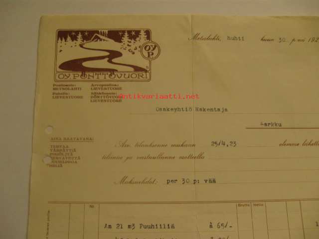 Oy Pönttövuori Lievestuore 30.4.1923 -asiakirja