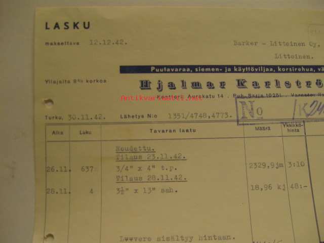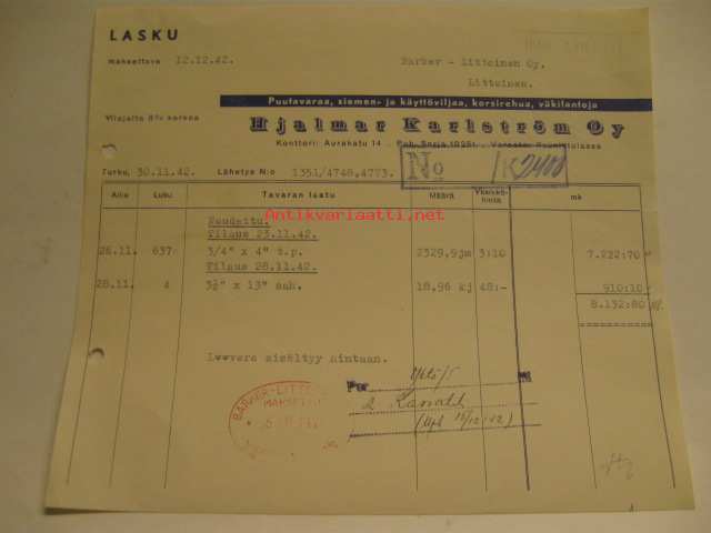 Hjalmar Karlström Oy Turku lasku 30.11.1942