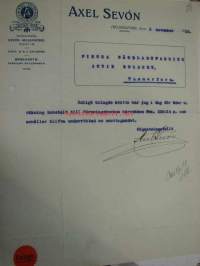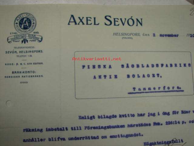 Axel Sevón Specialaffär i Maskinförnödenheter, Helsingfors. Dokument 2.11.1910
