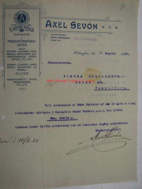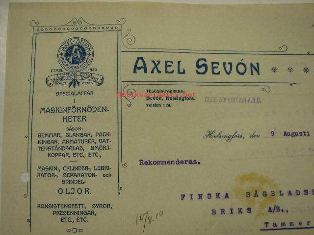 Axel Sevón Specialaffär i Maskinförnödenheter, Helsingfors. Dokument 9.8.1910
