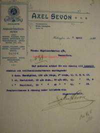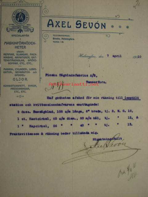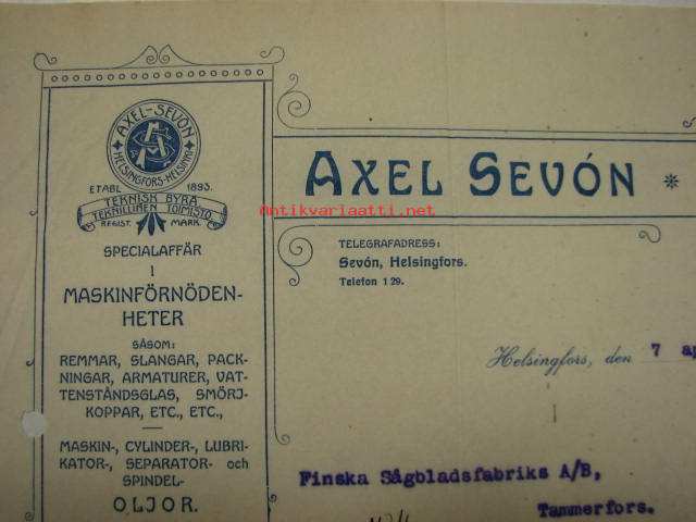 Axel Sevón Specialaffär i Maskinförnödenheter, Helsingfors. Dokument 7.4.1910