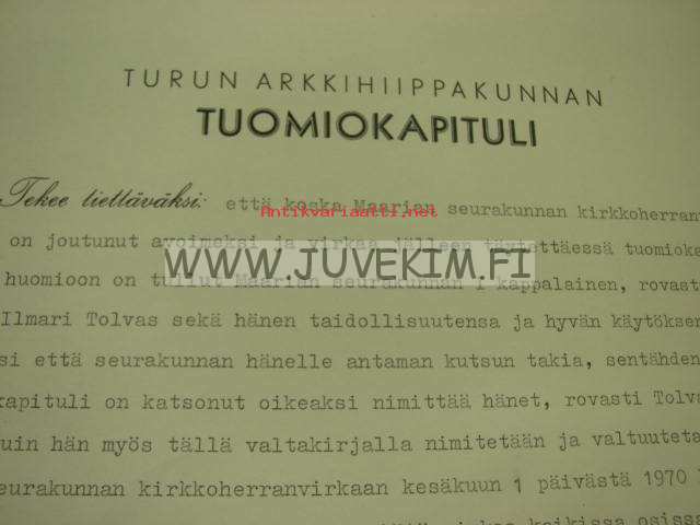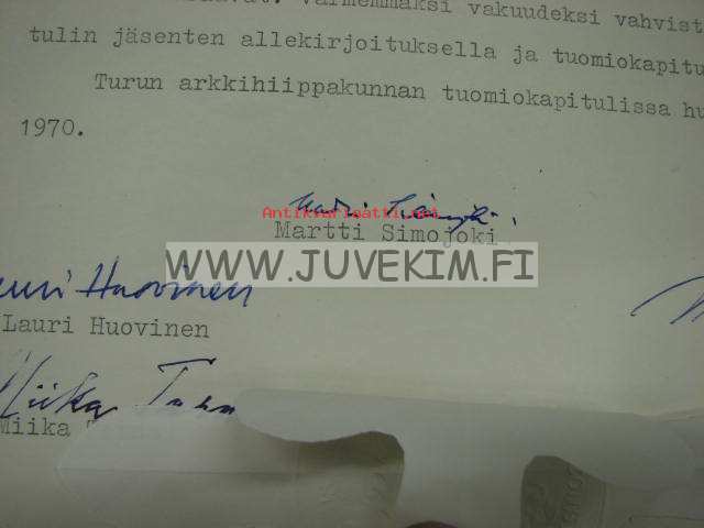 Unto Tolvas nimitys kirkkoherran virkaan... 1970 -allekirjoitus Martti Simojoki