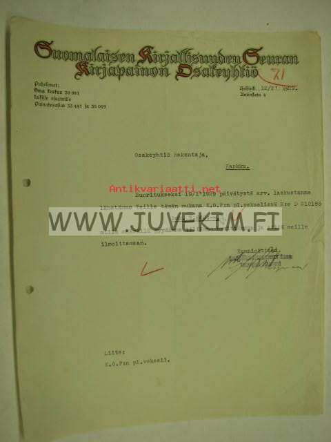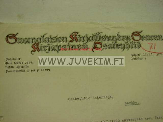 Suomalaisen Kirjallisuuden Seuran Kirjapainon Osakeyhtiö, Helsinki 12.2.1929 -asiakirja