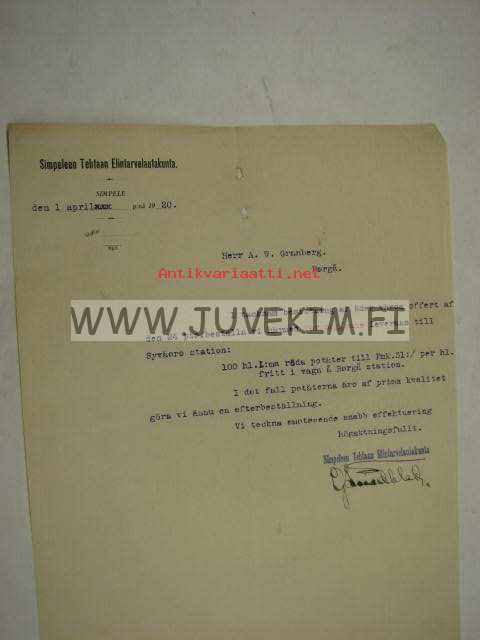Simpeleen Tehtaan Elintarvelautakunta, Simpele 1.4.1920 -asiakirja