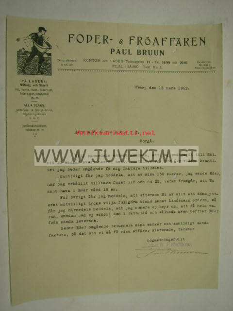Foder- & Fröaffären Paul Bruun, Viipuri / Säiniö 18.3.1922 -asiakirja
