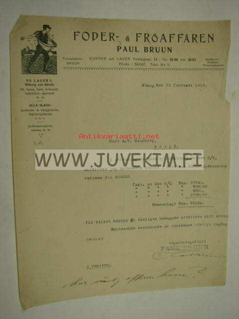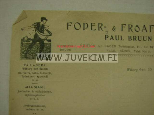 Foder- & Fröaffären Paul Bruun, Viipuri / Säiniö 23.2.1923 -asiakirja