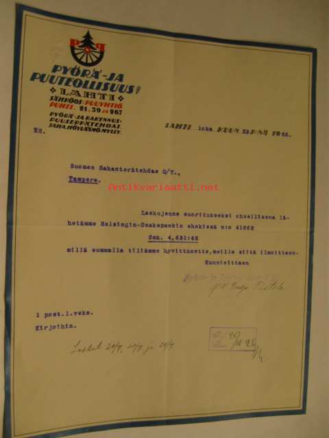 Pyörä- ja puuteollisuus Lahti, Lahti 23.10 1926 asiakirja