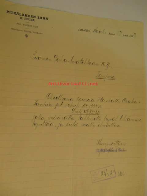 Pitkälahden Saha H. Peura Pitkälahti, 27.3.1923 asiakirja