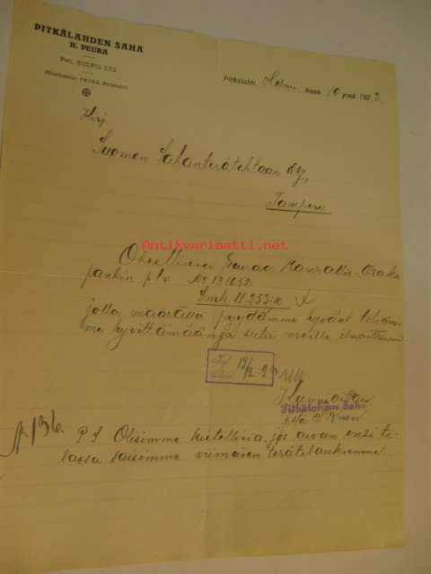 Pitkälahden Saha H. Peura Pitkälahti, 10.2.1923 asiakirja