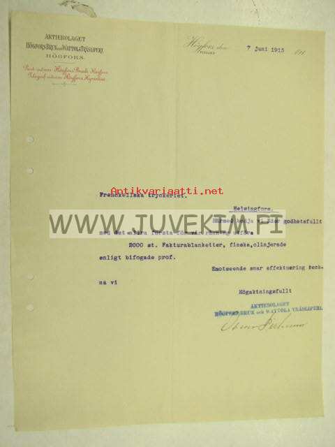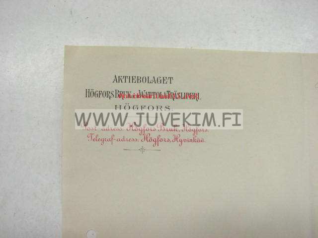 Aktiebolaget Högfors Bruk och Wattola Träsliperi, Högfors, 7.6.1913 -asiakirja