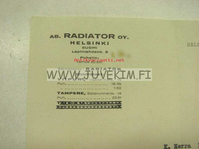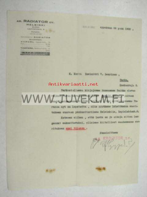 Ab Radiator Oy, Helsinki, 26.9.1932 -asiakirja