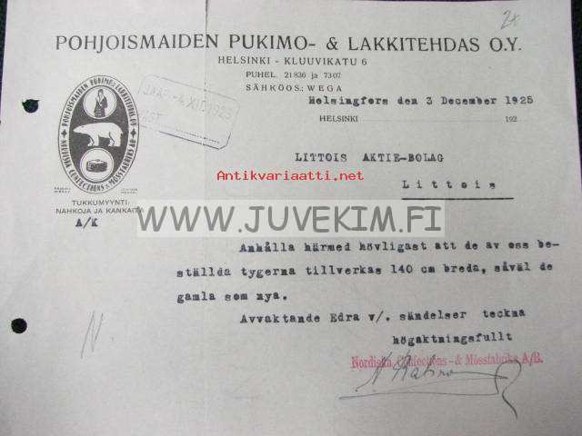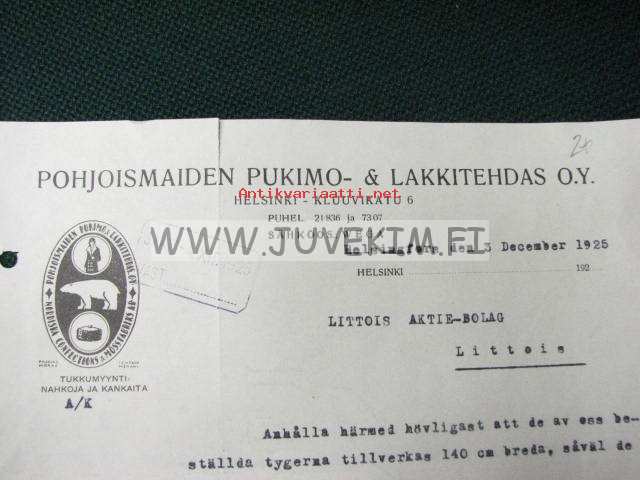 Pohjoismaiden Pukimo- & Lakkitehdas Oy, Helsinki, 3.12.1925 -asiapaperi (dokument)