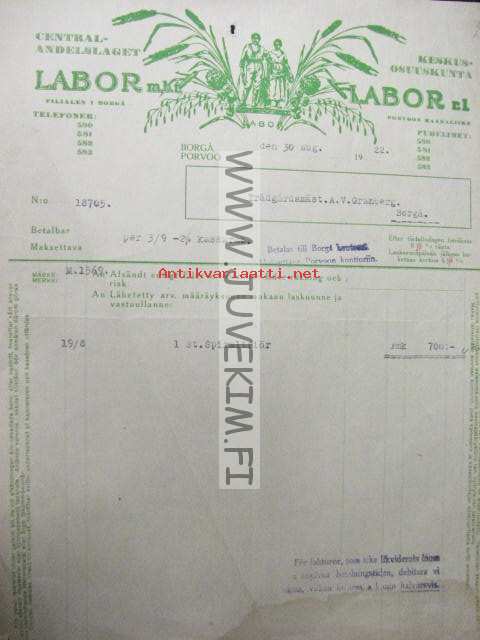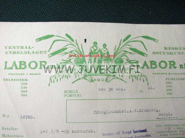 Centralandelslaget Labor mbt, Helsinki 30.8.1922 asiakirja, dokument