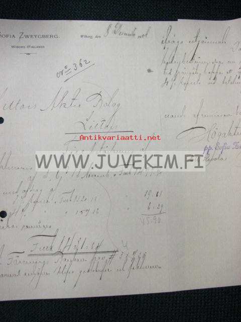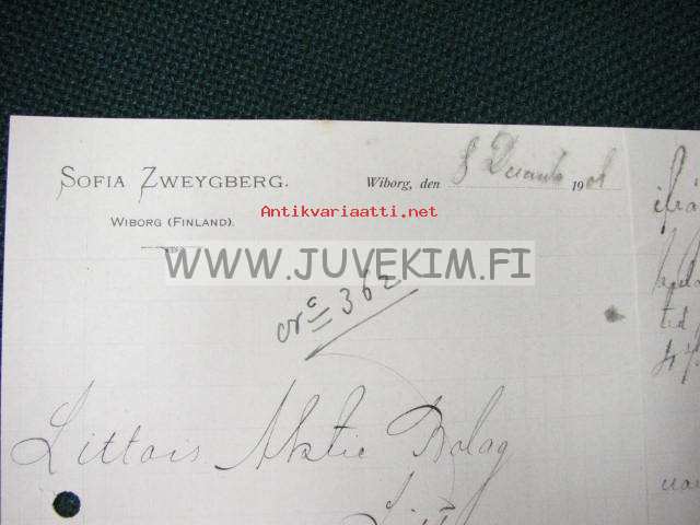 Oy Sofia Zweygberg Ab, Wiborg, (Viipuri) 8.12.1908 -asiakirja, dokument