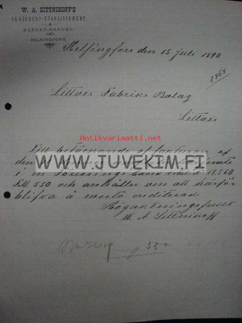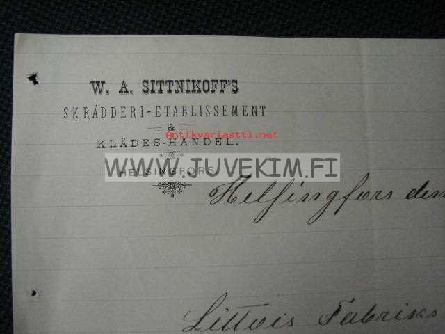 W.A. Sittnikoff's Skrädderi-Etablissement Helsingfors/Helsinki 15.7.1890 -asiakirja