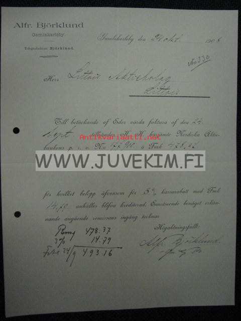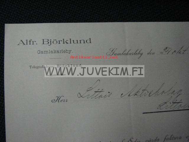 Alfr. Björklund, Gamlakarleby 24.10.1908 -dokument , asiakirja