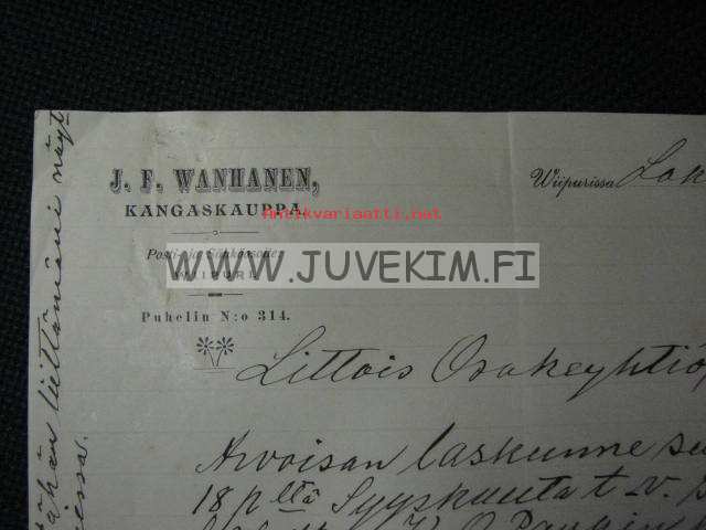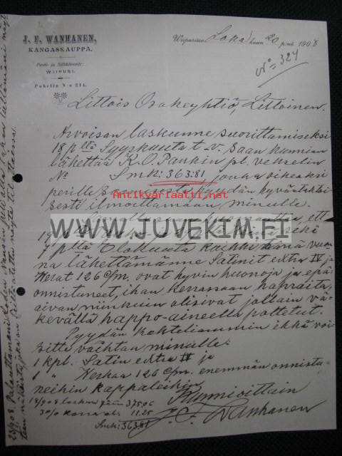 J. F. Wanhanen Kangaskauppa 20.10.1908 -asiakirja