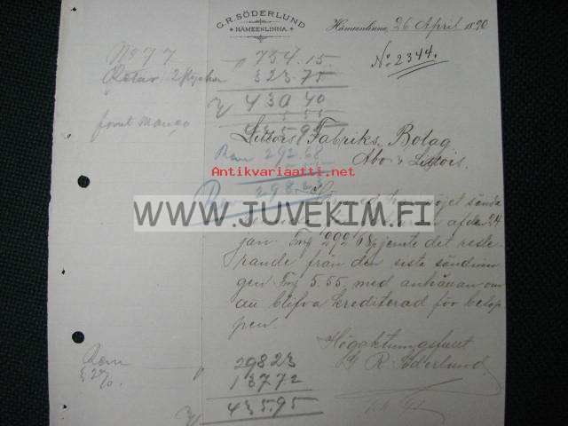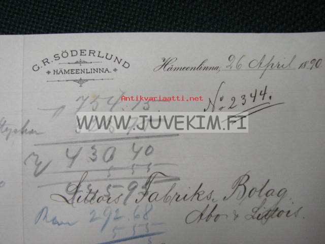 C.R.Söderlund, Hämeenlinna 226.4.1890 -dokument, asiakirja