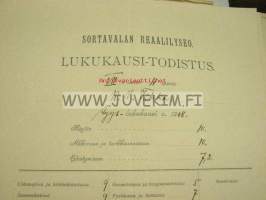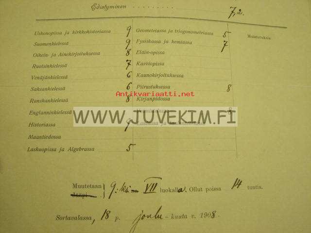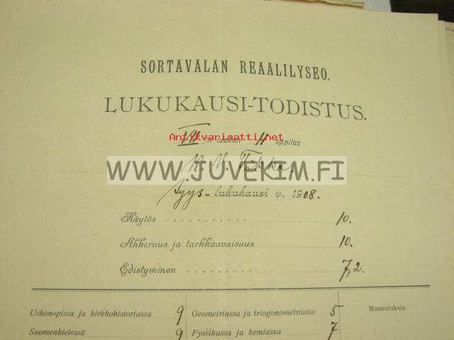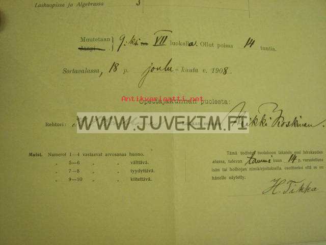 Sortavalan Reaalilyseo lukukausi-todistus K.V. Tikka syyslukukausi 1908