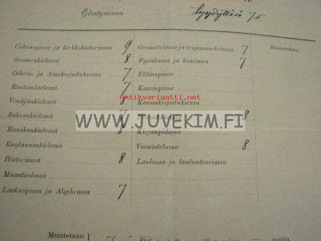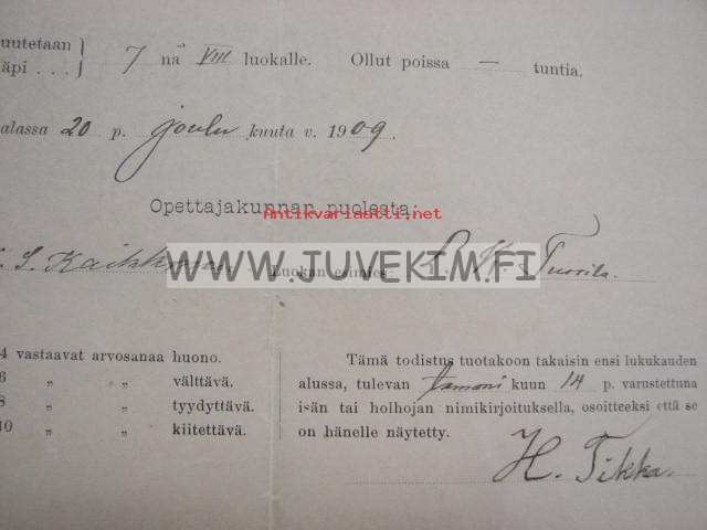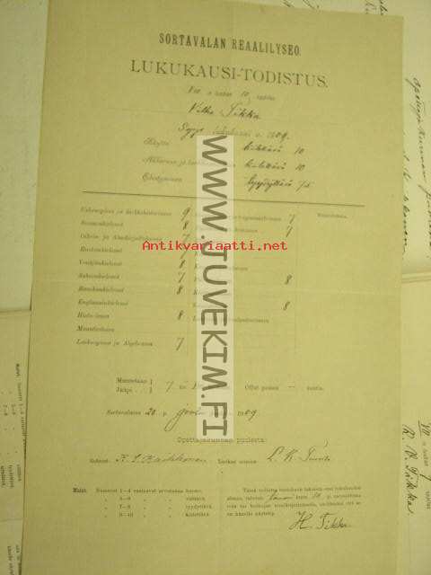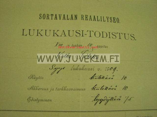 Sortavalan Reaalilyseo lukukausi-todistus K.V. Tikka syyslukukausi 1909