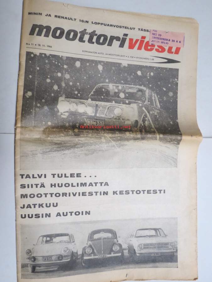 Moottoriviesti 1966 nr 11, Volkswagen Variant & 1500 testi, Opel Kadett testi, Opel Kadett Coupe, Morris MIni & Renault 16, Alfa 1300 GT Junior, Barracuda...