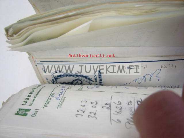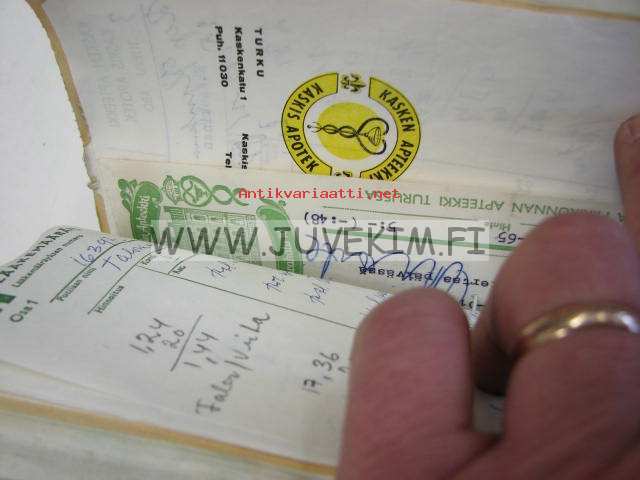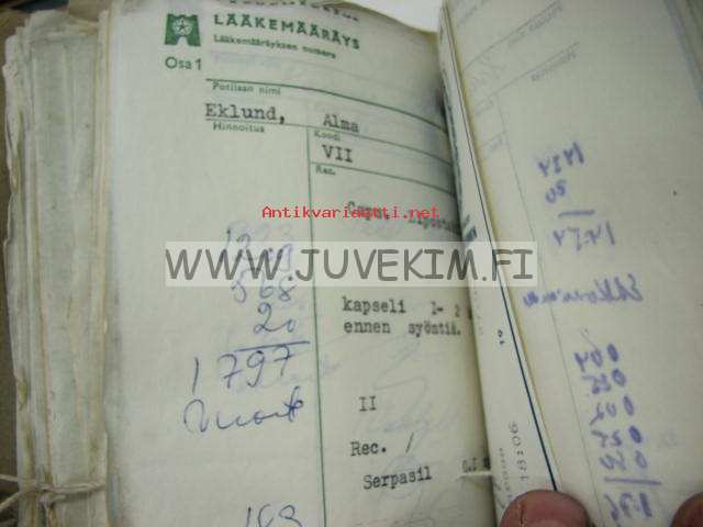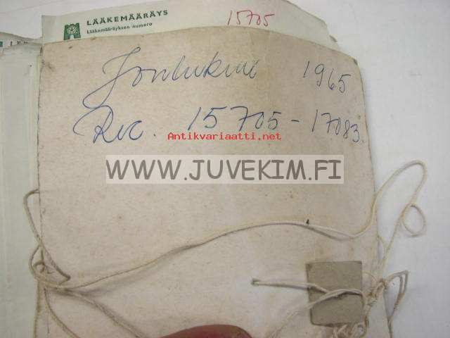 Lääkemääräyksia ja apteekkisignatuureja joulukuu 1965 -apteekin arkistonippu, merkitty; rec. 15705-17083