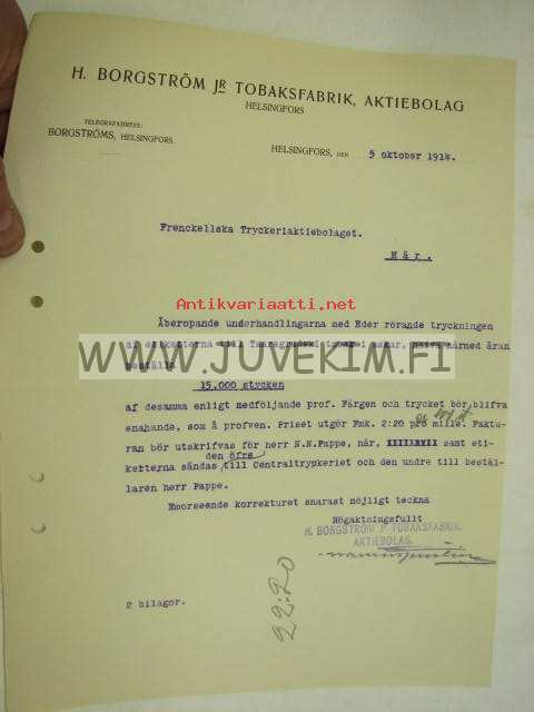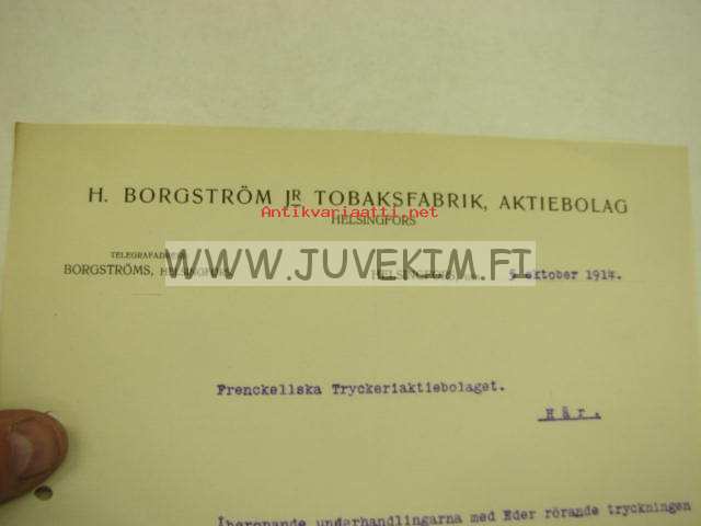 H. Borgström Jr Tobaksfabrik Ab, Helsinki 5.10.1914 -asiakirja