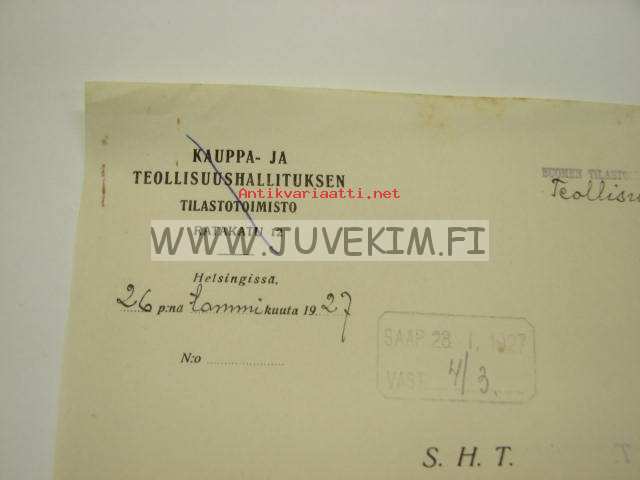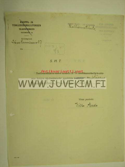 Kauppa- ja Teollisuushallituksen Tilastotoimisto / Suomen Tilastollinen Päätoimisto, Helsinki 27.1.1927 -asiakirja, omakätinen allekirjoitus Vilho Ann