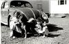 Vanhasta negatiivista kehitetty 9x13 uustuotantovalokuva, jossa kupla, koira ja tytöt poseeraavat kameralle.