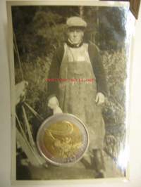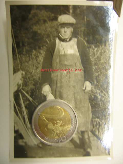 Noin 6 x 9 cm valokuva. Venehommissa ollaan ja kaverilla on nahkaessu yllään. Kalastajia?