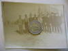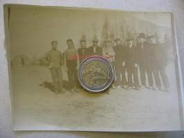 Noin 8 x 11 cm valokuva jalkapalloilijoista, huomaa siviilivarusteet, kuva ruskeasävyinen.