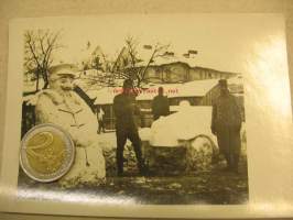 Noin 9 x 13 cm valokuva. Osattiin sitä lumiveistoksia ennenkin. Tunnistamaton maa ja sotilaat. todella erikoinen otos.