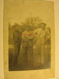 9 x 13 cm valokuva ylpeistä ammattimiehistä pillitupakka suussa. Huomaa poikasenkin ote elämään.