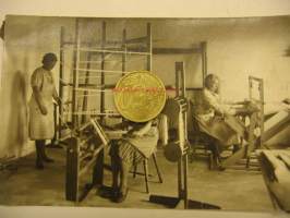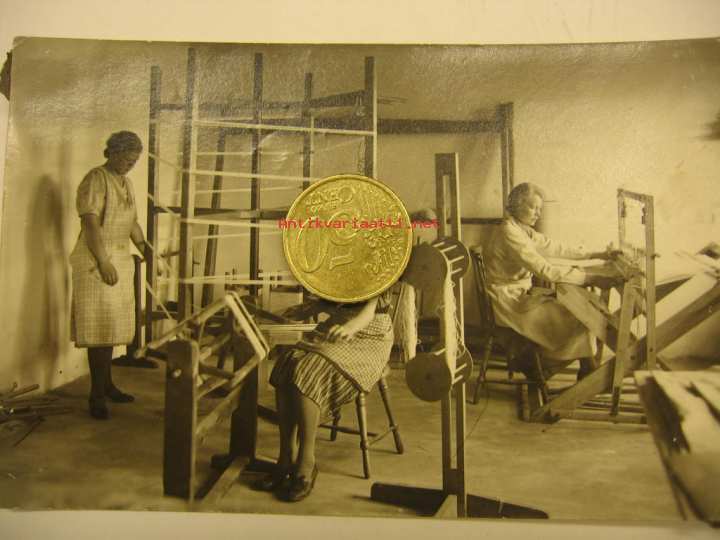 9 x 14 cm valokuva erilaisista lanka- ja kudontalaitteista.