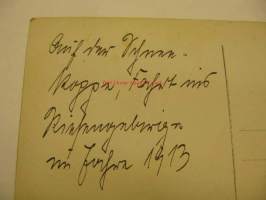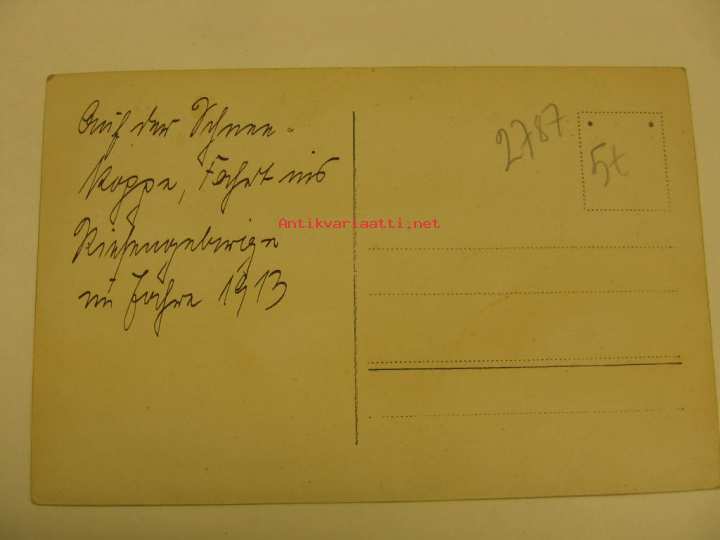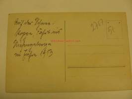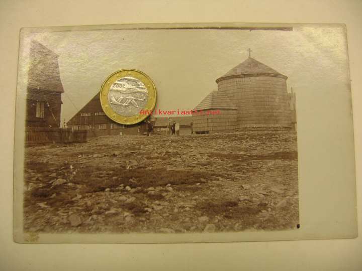 Noin 9 x 14 cm valokuva tunnistamattomista rakennuksista, ei ainakaan Suomesta. Huomaa vanttiruuvit talon kiinnityksenä ja risti pyöreän rakennuksen katolla. Erittäin vaikeaselkoinen kirjoitettu teksti kuvan takana.