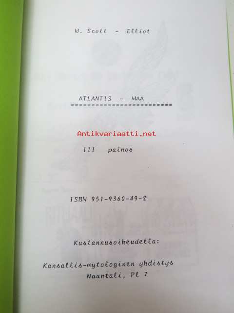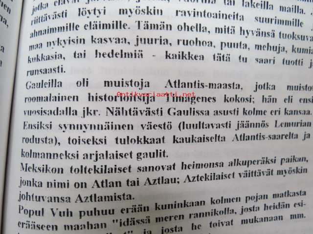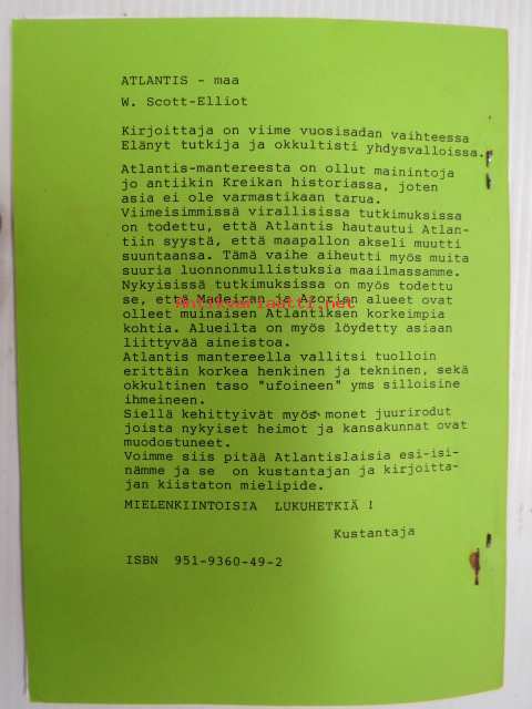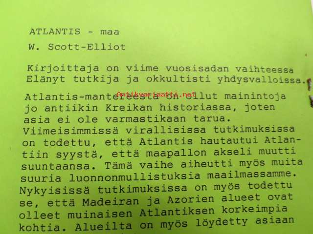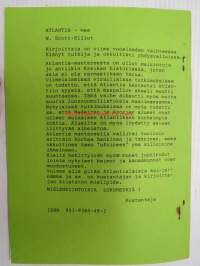 Atlantis-Maa - Pekka Siitoin -tuotantoa "Kirjoittaja on USA:ssa 1800-1900 luvun vaihteessa elänyt tutkija ja okkultisti. Atlantis -mantereesta on mainintoja jo Kreikan historiassa, joten asia ei liene tarua. Uusimpien tutkimusten mukaan maapallon akselin suunnanmuutos aiheutti Atlantis -mantereen hautautumisen Atlanttiin.15 x 21 cm."