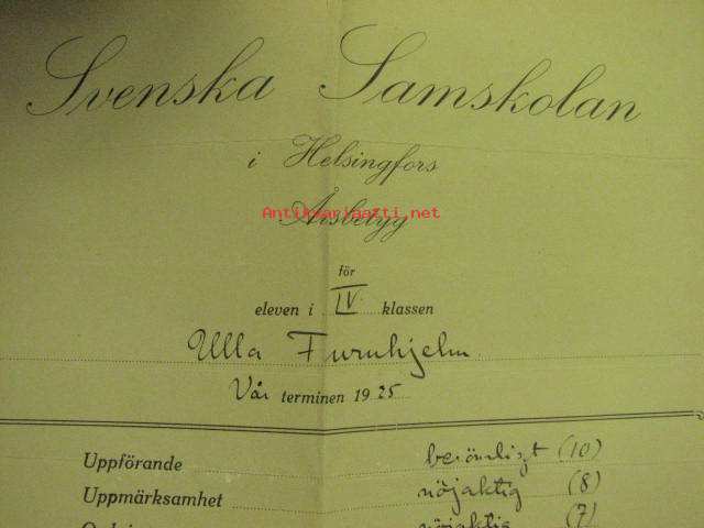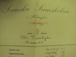 Svenska Samskolan i Helsingfors Ulla Furuhjelm Årsbetyg 1925 -lukuvuositodistus