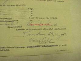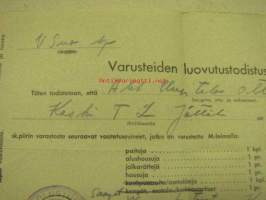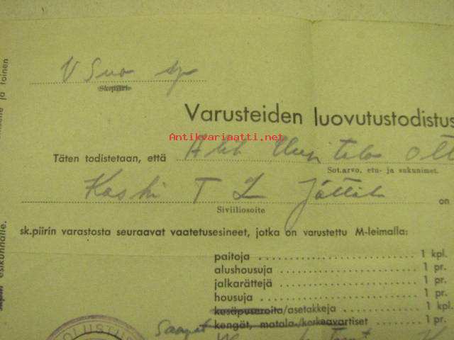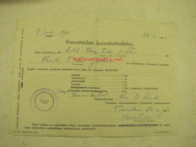Varusteiden luovutustodistus 24.11.1944