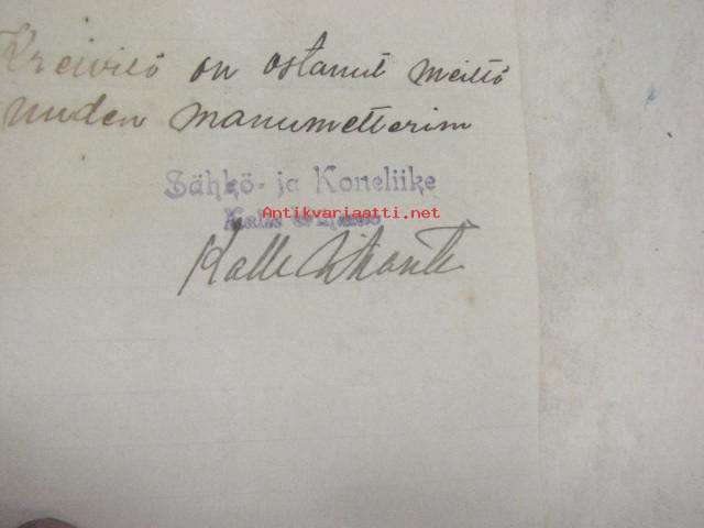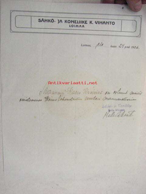 Sähkö- ja Koneliike K. Vihanto, Loimaa, 24.8.1926 -asiakirja