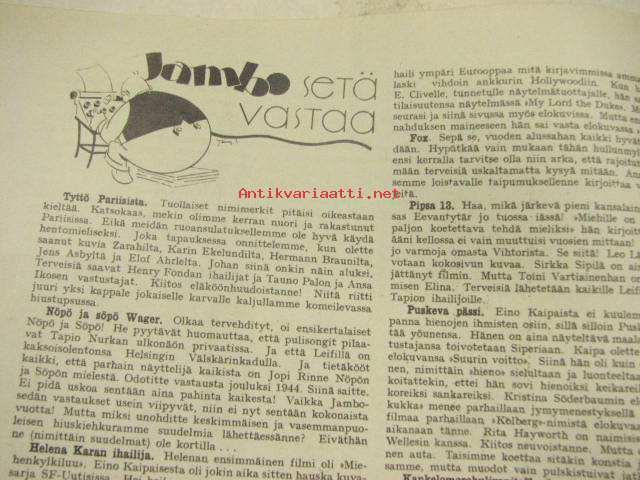 | Saatavilla | 1 kpl | | Julkaisuvuosi | 1944 | | Sivuja | 18 | | Kunto | K2 | | Sidonta/painoasu | Lehti | | Kielet | Suomi |