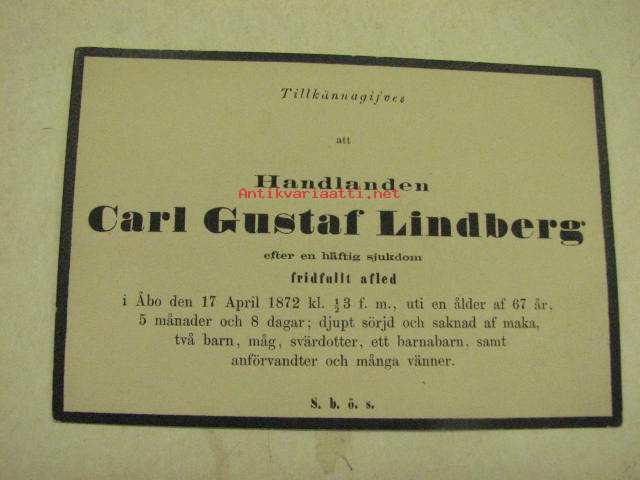 Handlanden Carl Gustaf Lindberg... fridfullt afled i Åbo 17.4.1872 -kuolinilmoituskortti