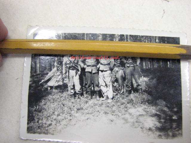 6 x 9 cm valokuva, miehillä kettinkejä ja teräsrenkaita roikkumassa kaulassa ja vyötäisillä, viestiporukkaa?