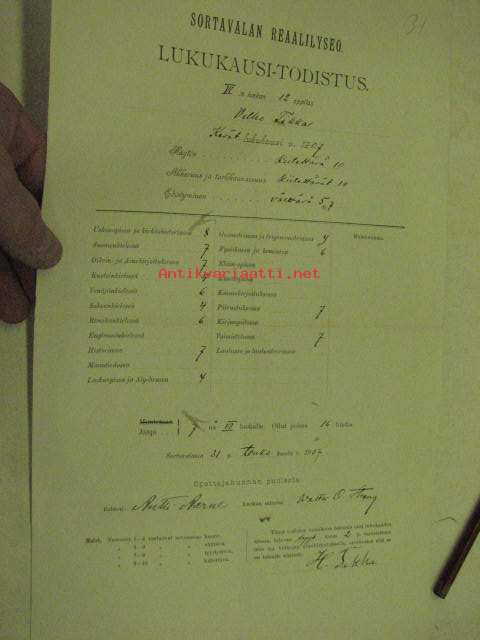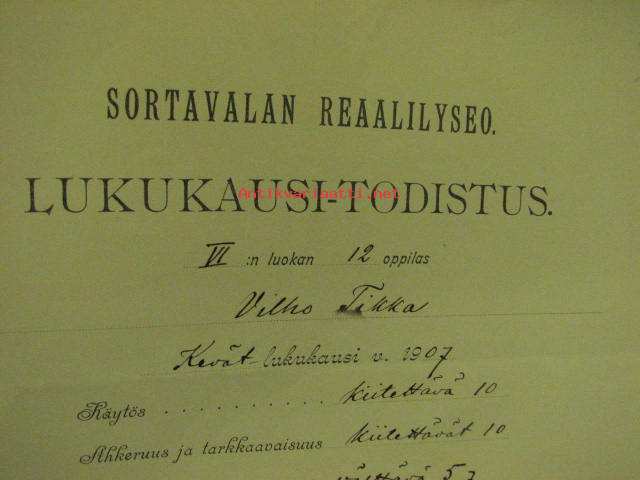 Sortavalan Reaalilyseo, lukukausi-todistus Vilho Tikka 1907